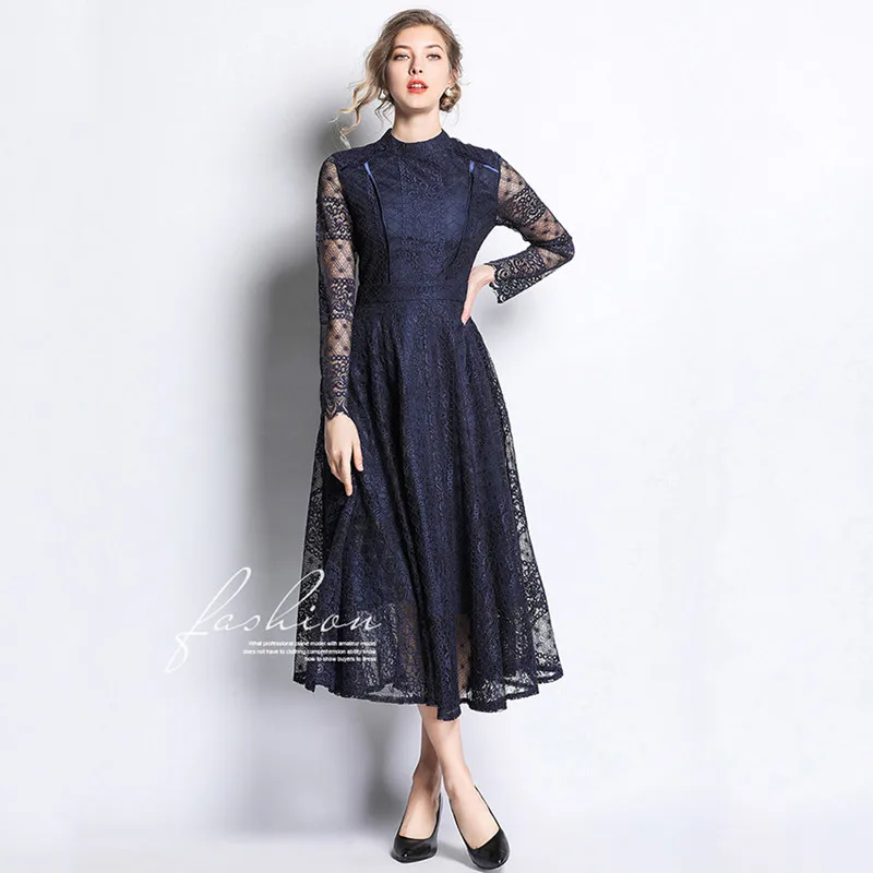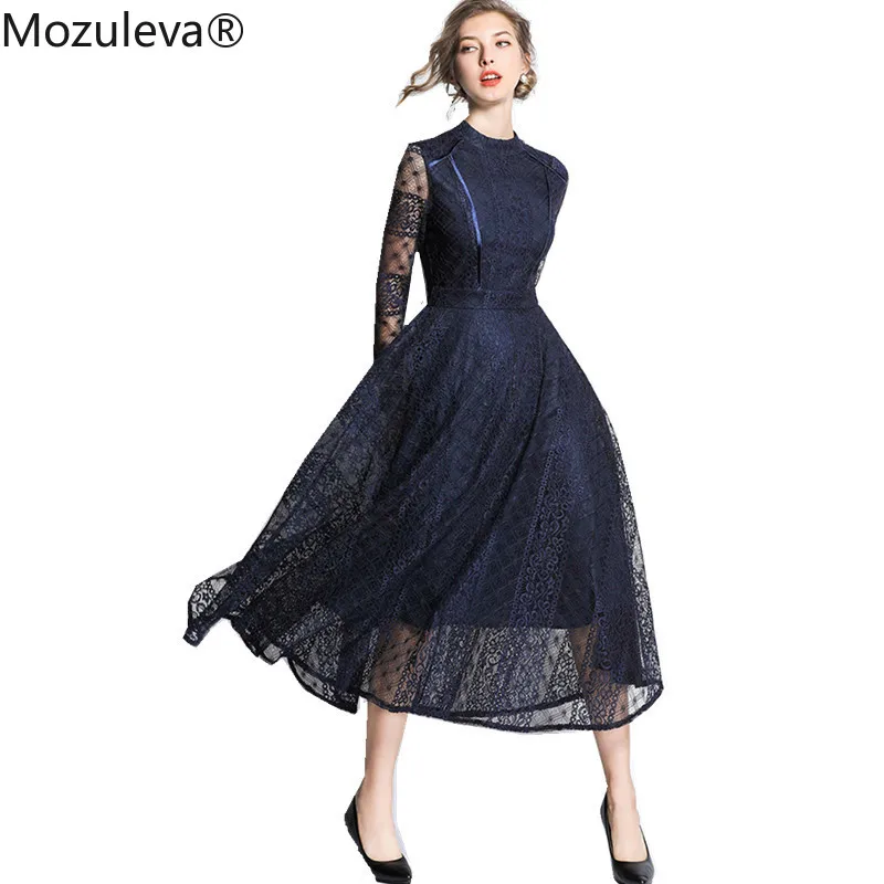 Product Name: Mozuleva 2019 Designer granatowa sukienka z niebieskiej koronki Runway kobiety koronkowa kwiatowa sukienka z dziurami z długim rękawem stójka długa sukienka