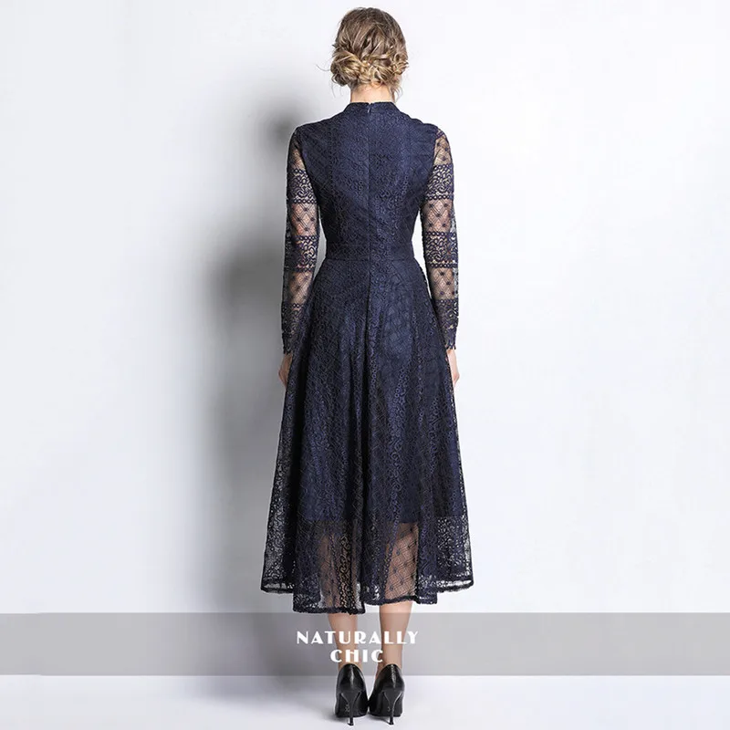 Special Offer Mozuleva 2019 Designer granatowa sukienka z niebieskiej koronki Runway kobiety koronkowa kwiatowa sukienka z dziurami z długim rękawem stójka długa sukienka Discount 25% Today!