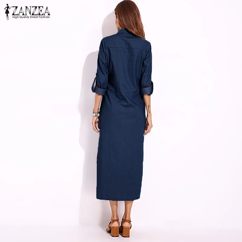 Special Offer S 5XL ZANZEA damska na co dzień z długim rękawem przyciski w dół koszula sukienka 2019 nowa wiosna bawełniana pościel Denim niebieska luźna, z wycięciem praca Vestido Discount 25% Today!