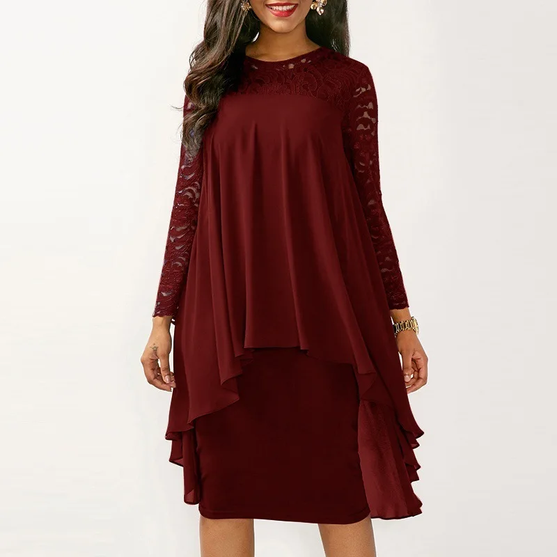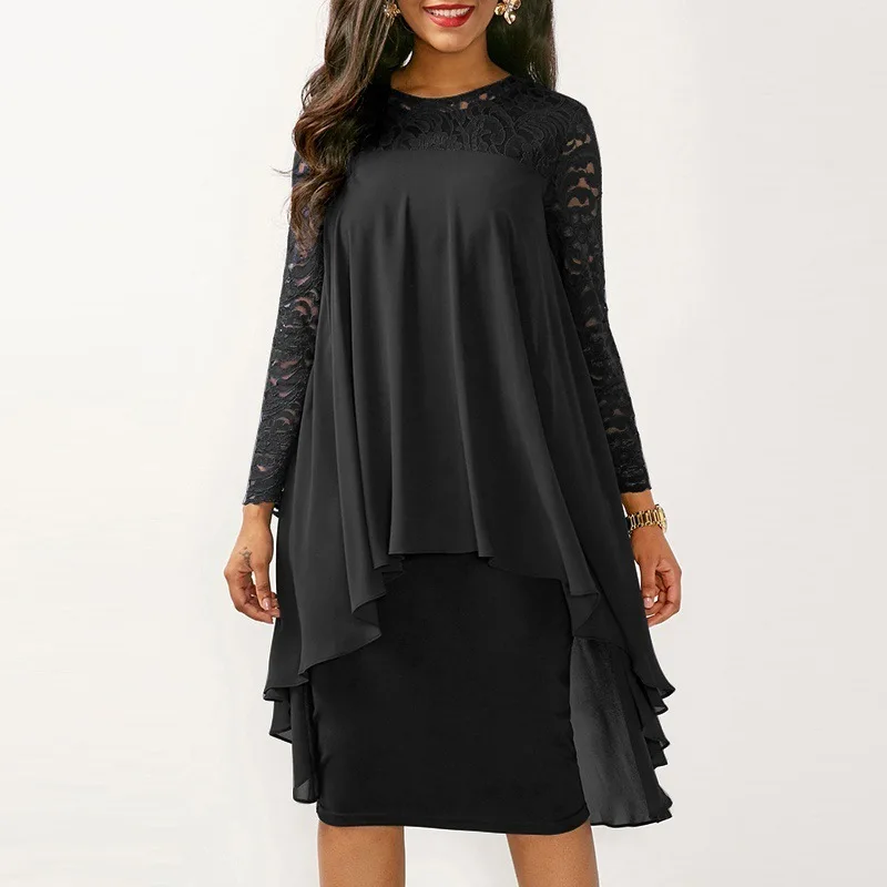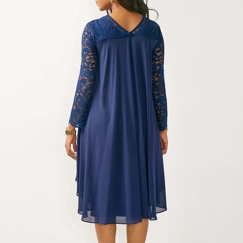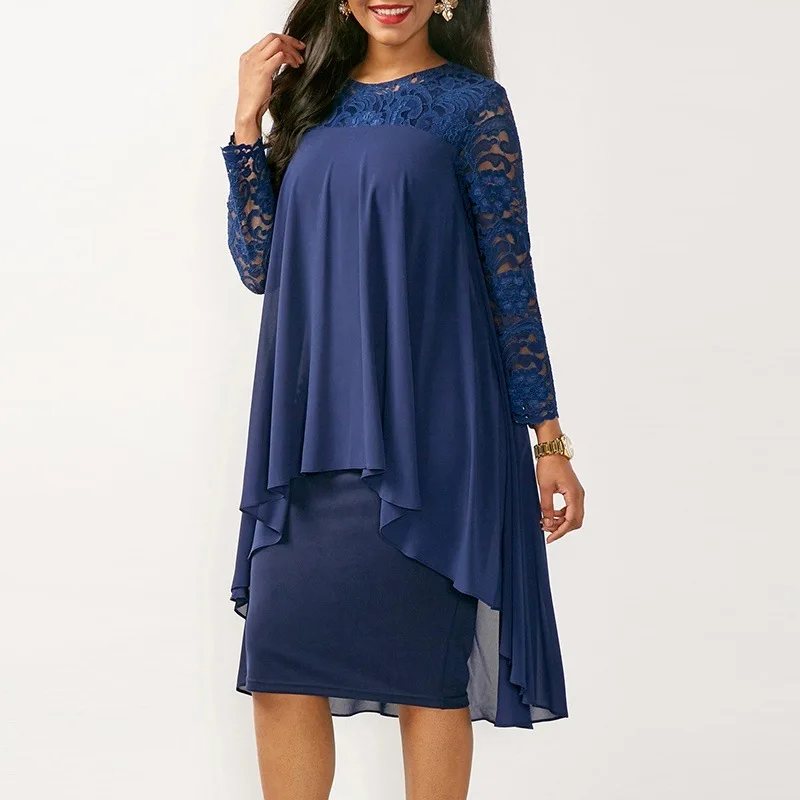 Product Name: 5XL Plus rozmiar jesień sukienka kobiety Sexy Party Ruffles okładka koronkowa sukienka elegancka szczupła szyfonowa Patchwork nieregularne modne sukienki niebieskie