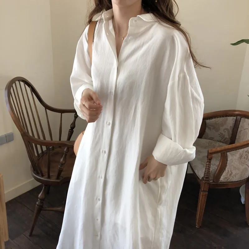 Special Offer Niebieska długa sukienka koszulowa z długim rękawem wiosna patchworkowy w stylu casual biała sukienka bawełniana kołnierz guziki luźne sukienki szata Femme Vestido Discount 44% Today!