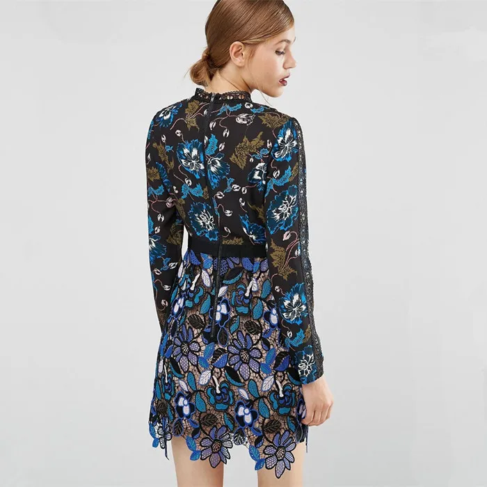 Product Name: 2019 Vintage kobiety modne niebieskie koronkowe Runway sukienek z długim rękawem Hollow Out Leaf line sukienka do kolan