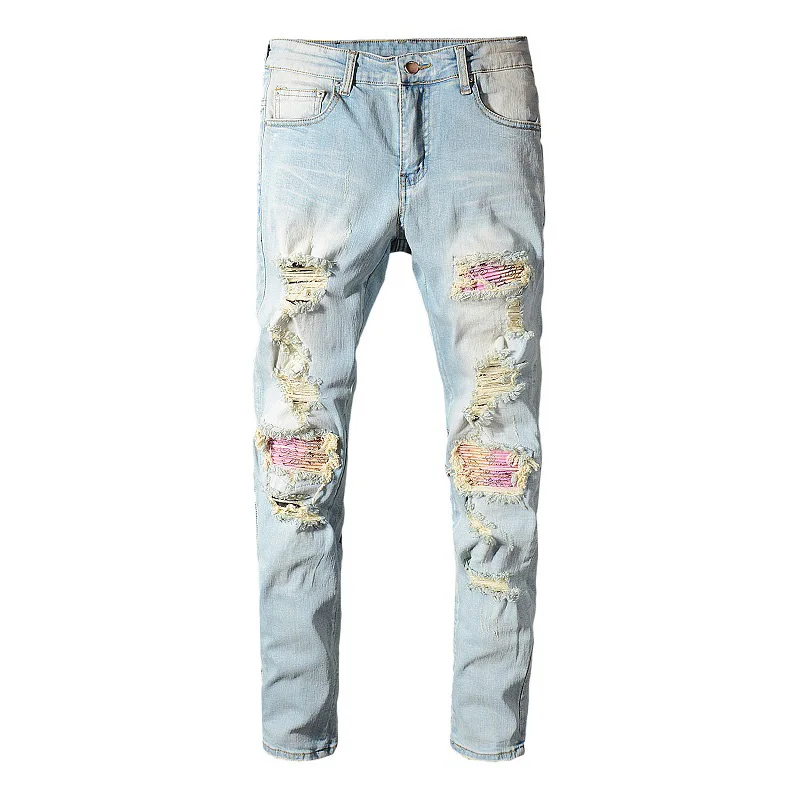 Product Name: Sokotoo męska patchwork bandanna z wzorem paisley jeansy dla motocyklistów jasnoniebieskie otwory zgrywanie skinny stretch spodnie dżinsowe spodnie