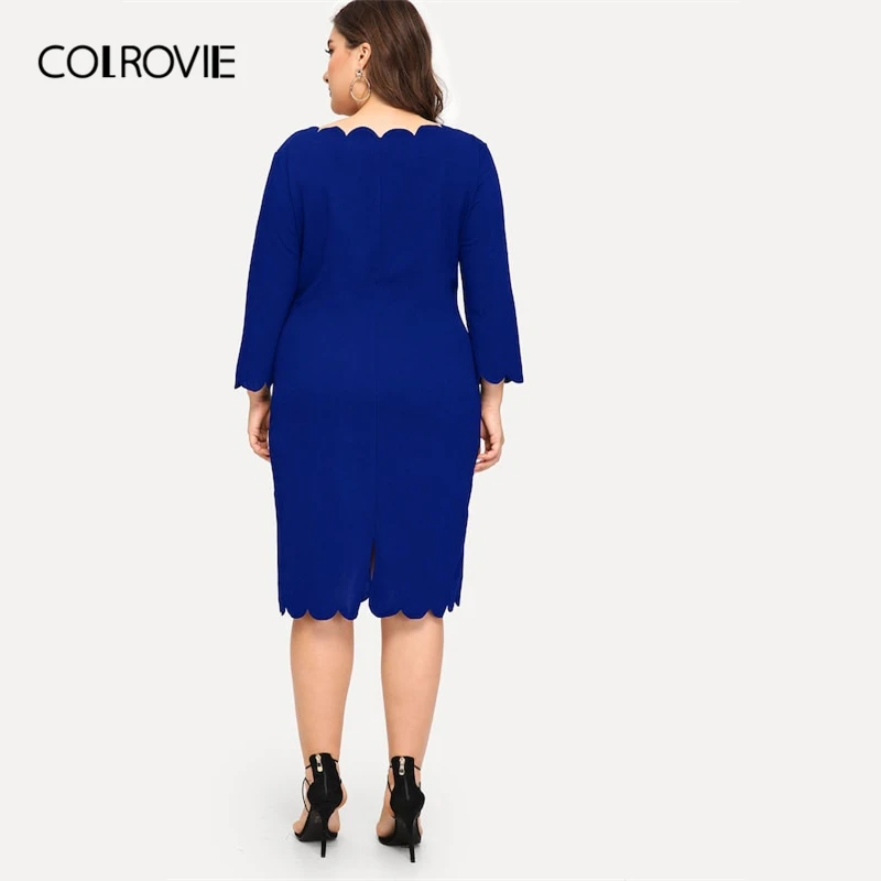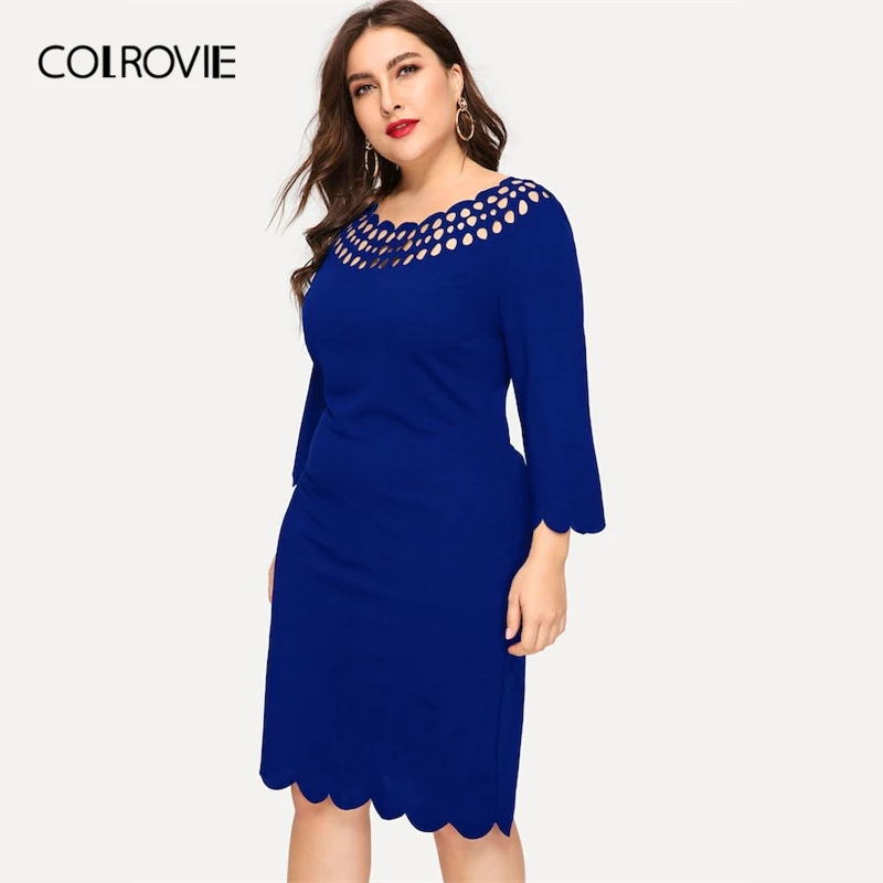 Special Offer COLROVIE Plus rozmiar niebieski stałe muszelki Hem laserowo wycinane ołówek elegancka sukienka kobiety 2019 wiosna koreański z rozcięciem średniej długości swobodne sukienki Discount 40% Today!