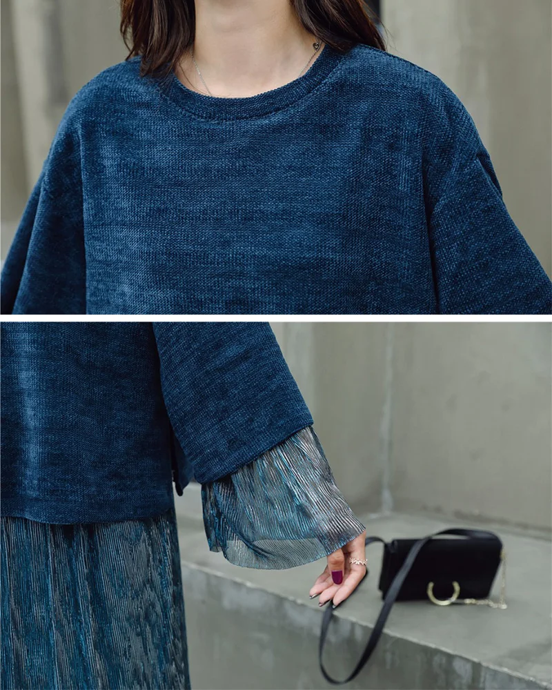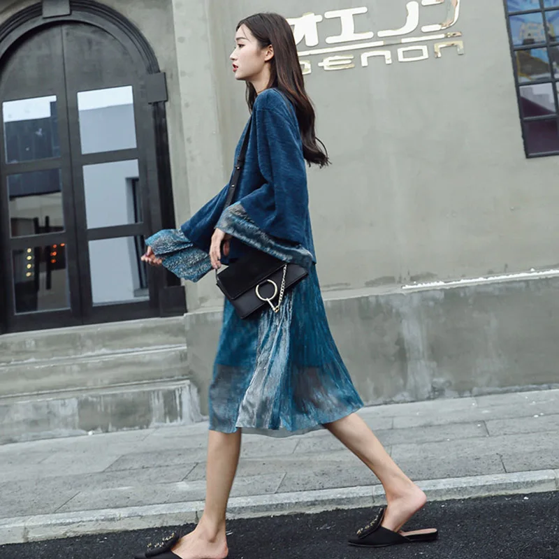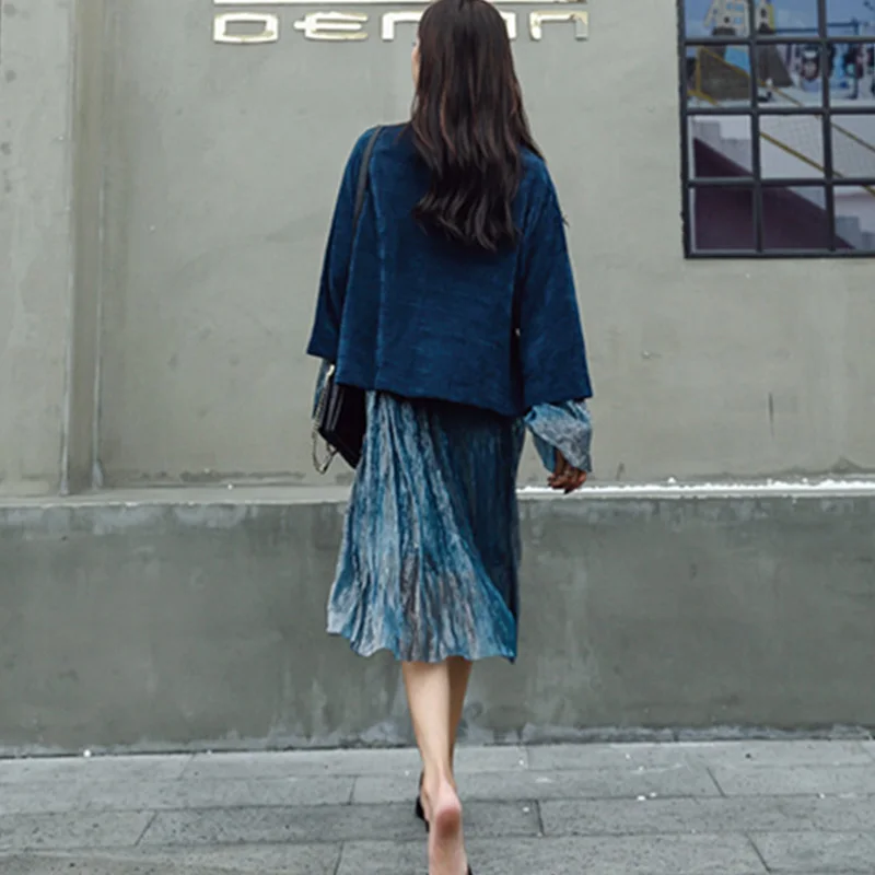 Product Name: Cheerart w stylu Vintage sukienka plisowana kobiet granatowy niebieska aksamitna sukienka imitacja dwuczęściowej Midi błyszcząca sukienka luźna, w stylu swing sukienka jesień 2018