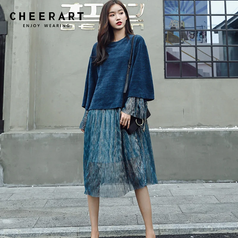 Special Offer Cheerart w stylu Vintage sukienka plisowana kobiet granatowy niebieska aksamitna sukienka imitacja dwuczęściowej Midi błyszcząca sukienka luźna, w stylu swing sukienka jesień 2018 Discount 40% Today!
