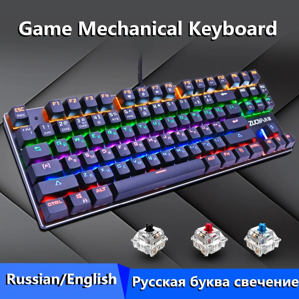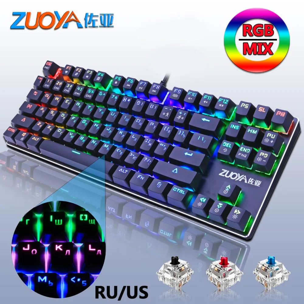 Special Offer ZUOYA gra klawiatura mechaniczna 87 klawiszy niebieski czarny czerwony przełącznik RGB MIX LED light USB przewodowa Ru US klawiatura do gier na PC Laptop Discount 40% Today!
