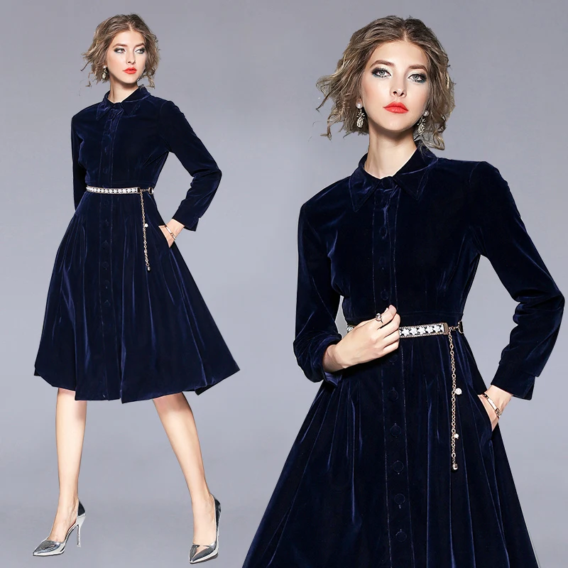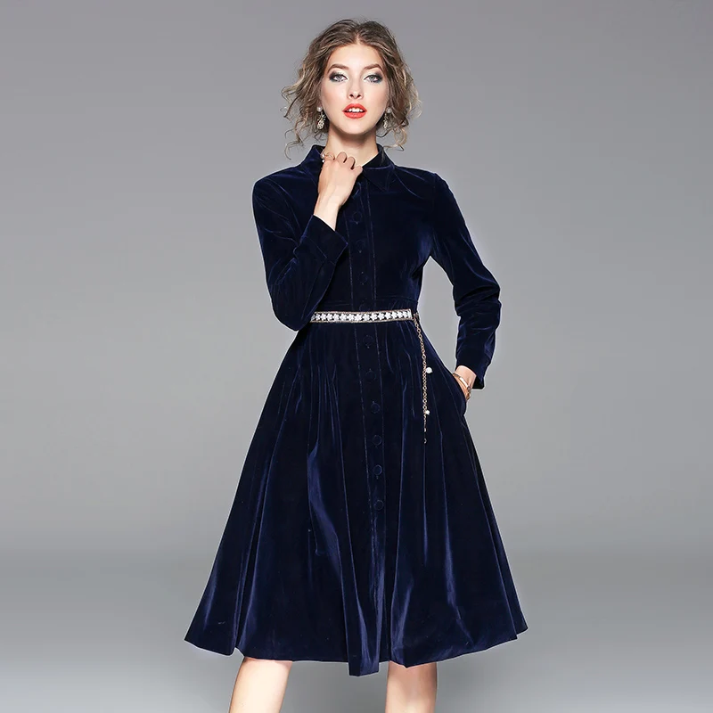 Product Name: OL Lapel gruba aksamitna niebieska sukienka biurowa eleganckie kobiety z długim rękawem zimowe sukienki Moda Mujer 2019 Midi Party Dress Jurken K8861