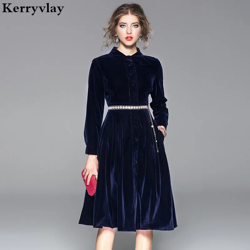 Special Offer OL Lapel gruba aksamitna niebieska sukienka biurowa eleganckie kobiety z długim rękawem zimowe sukienki Moda Mujer 2019 Midi Party Dress Jurken K8861 Discount 0% Today!
