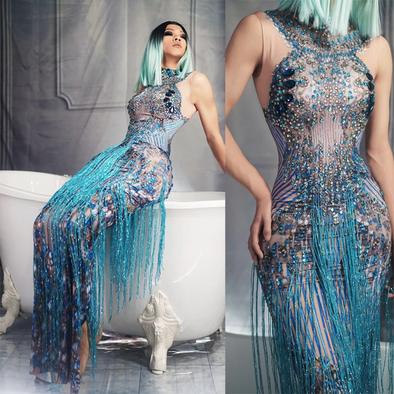 Special Offer Kobiety nowe błyszczące niebieskie cyrkonie frędzle bez rękawów długa sukienka seksowna piosenkarka wydajność elastyczna sukienka w rozmiarze skinny Bar kostium imprezowy Discount 28% Today!