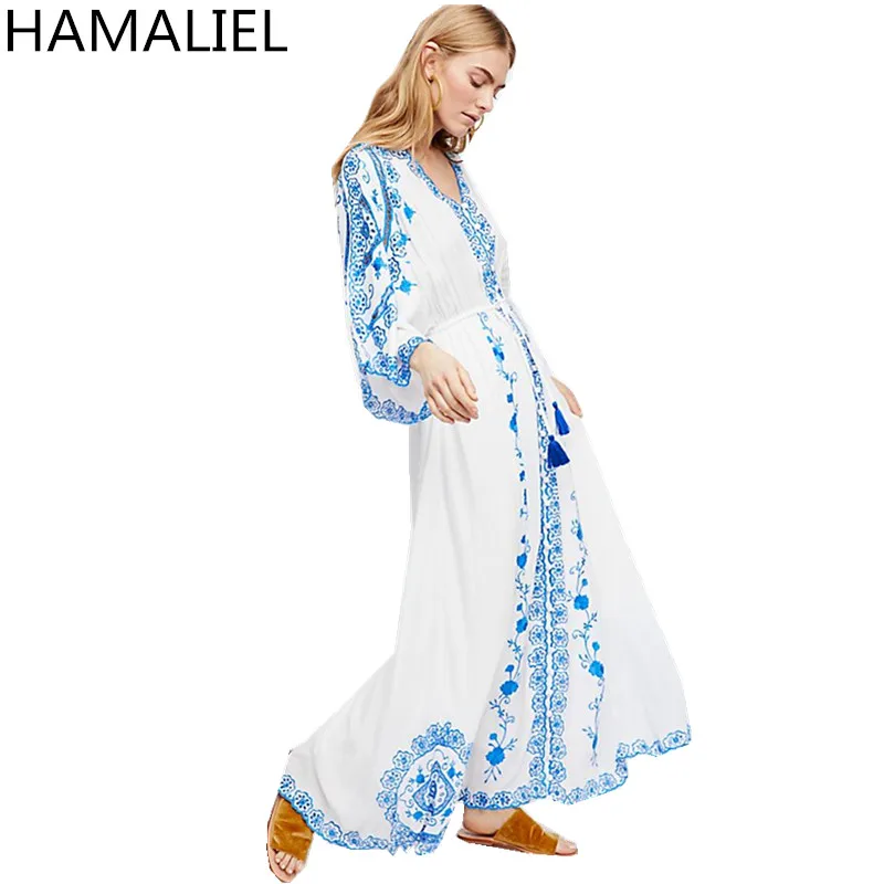 Special Offer Boho niebieski i biały porcelany wakacje kobiet długa sukienka 2018 lato bawełna biały haft kwiaty Hollow Out Maxi sukienka plażowa Discount 32% Today!