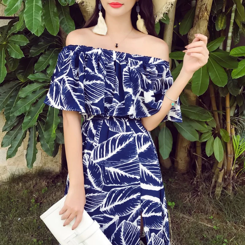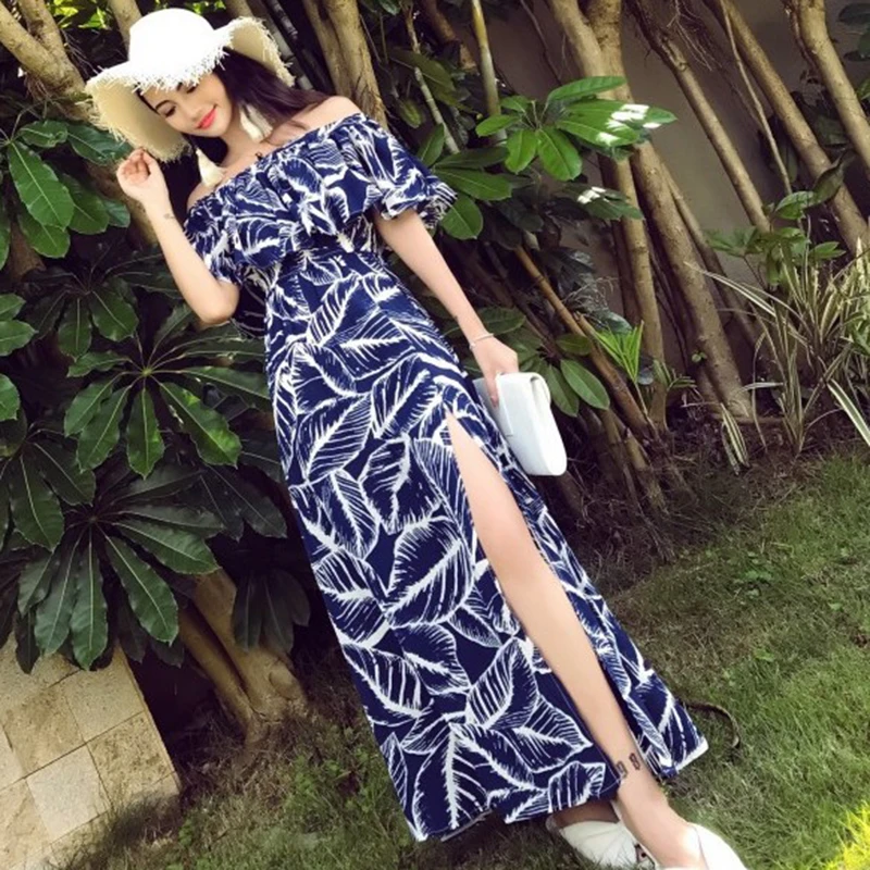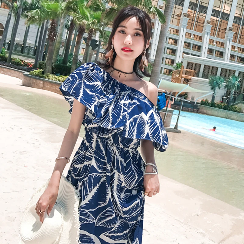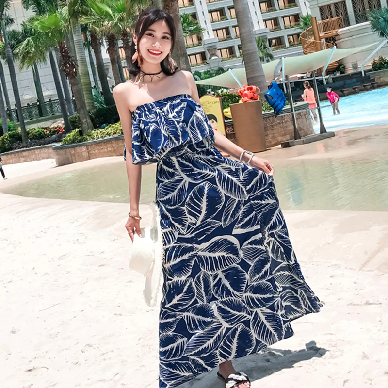 Special Offer Lato kobiety drukowane Party Dress długi tropikalny bez ramiączek wakacje koreański szyfonowa rocznika Maxi niebieski kobiet Sundress Runway 2020 Discount 34% Today!