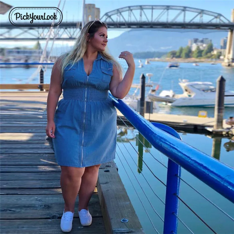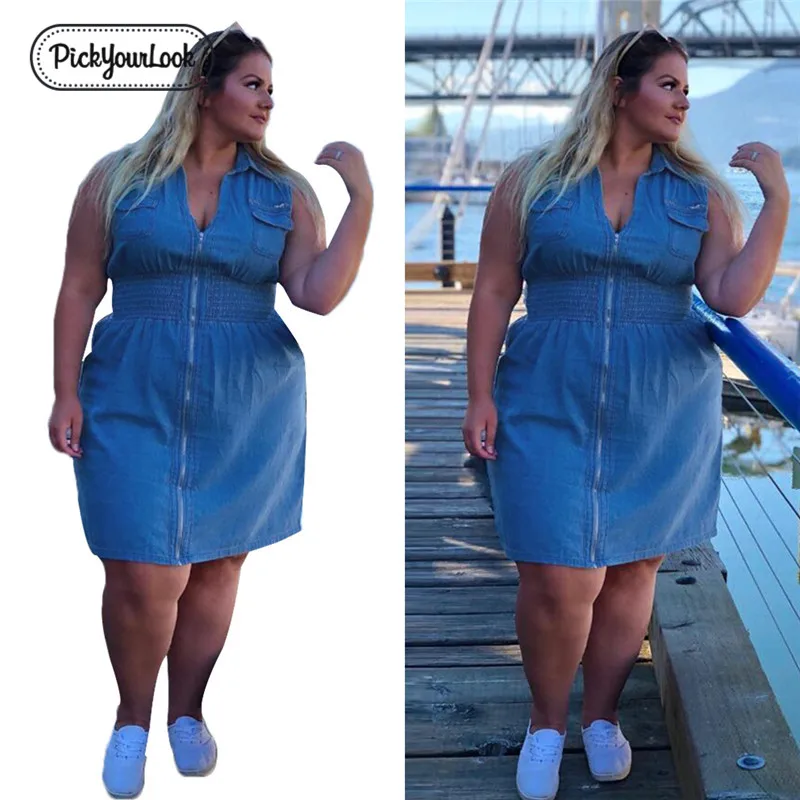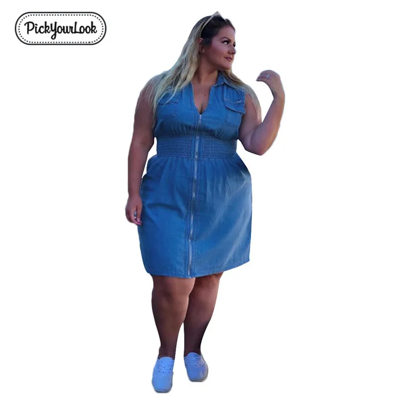 Special Offer Pickyourlook Denim kobiety sukienka Plus rozmiar lato bez rękawów modne niebieskie sukienki damskie Mini kieszeń na suwak V Neck duża sukienka pani Discount 40% Today!