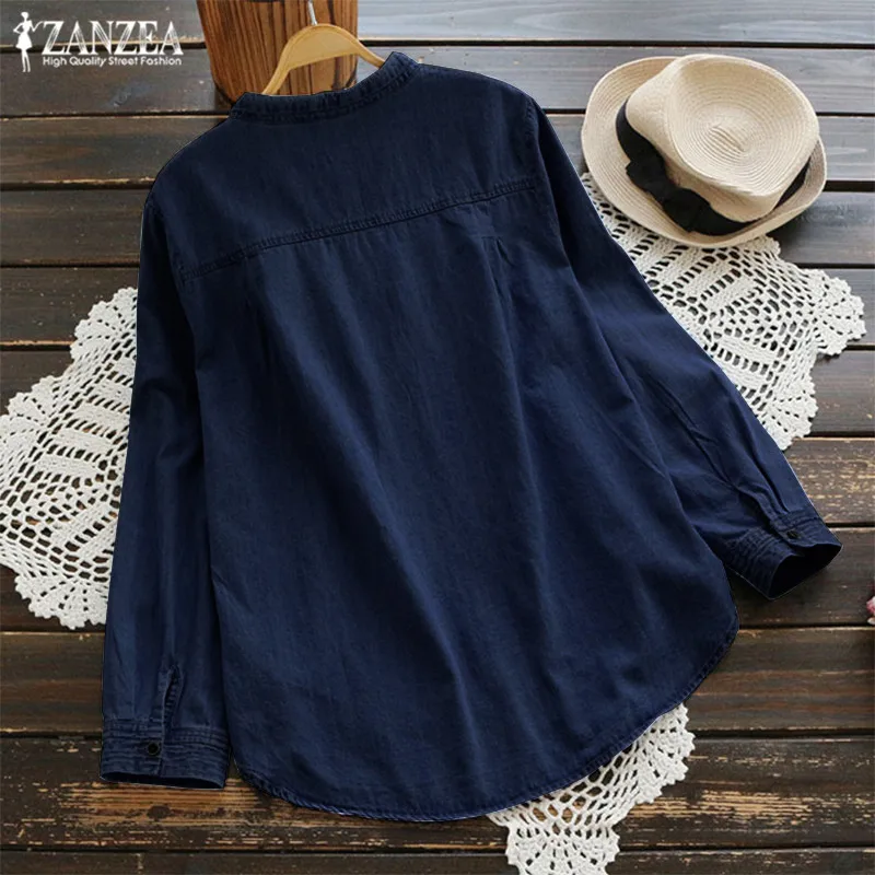 Special Offer ZANZEA 2019 damska Denim niebieskie koszule moda jesienna bluzka Casual przycisk V Neck z długim rękawem topy Plus rozmiar Jean tunika Blusa 5XL Discount 40% Today!