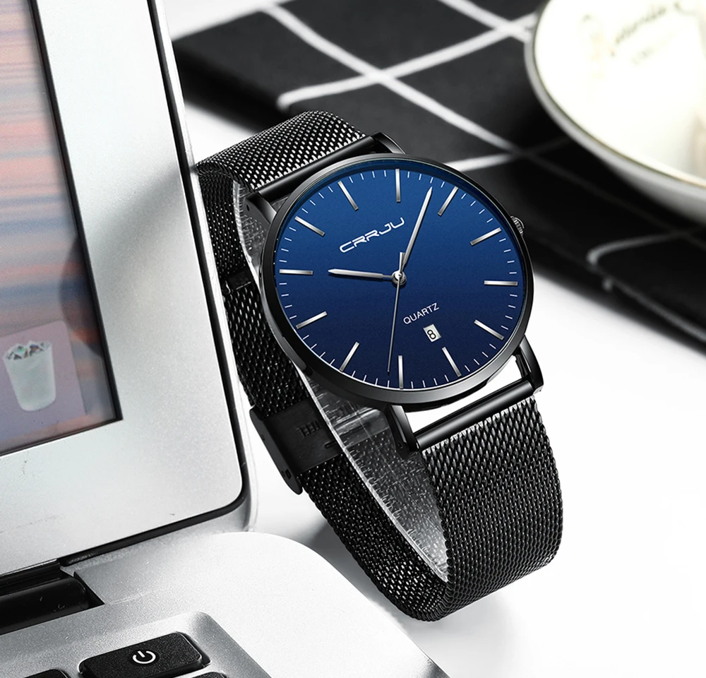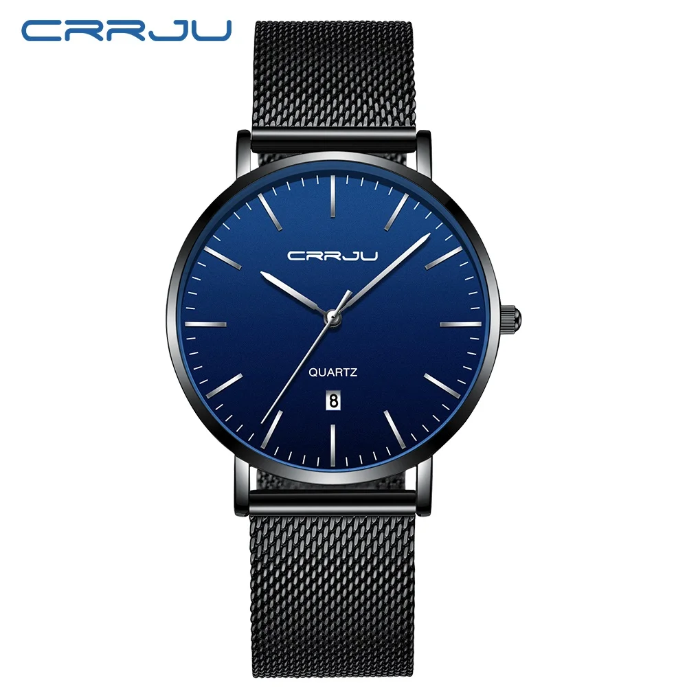 Special Offer Unisex prezent zegarki CRRJU mężczyzna niebieska tarcza Mesh zegarki Ultra cienki zegarek kwarcowy na co dzień dla mężczyzn Sport data zegar Relogio Masculino Discount 90% Today!