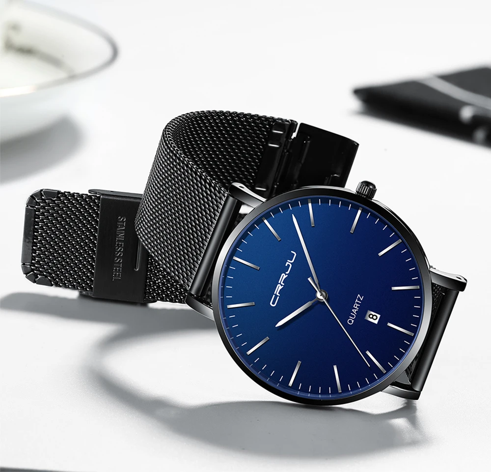 Product Name: Unisex prezent zegarki CRRJU mężczyzna niebieska tarcza Mesh zegarki Ultra cienki zegarek kwarcowy na co dzień dla mężczyzn Sport data zegar Relogio Masculino