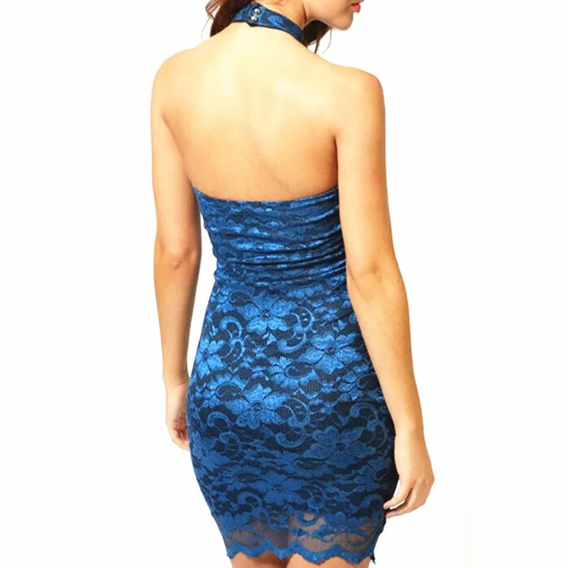 Special Offer Damskie eleganckie wesele Sexy klub nocny Halter Neck bez rękawów płaszcza Bodycon koronkowe sukienki krótkie niebieski Off ramię Discount 22% Today!