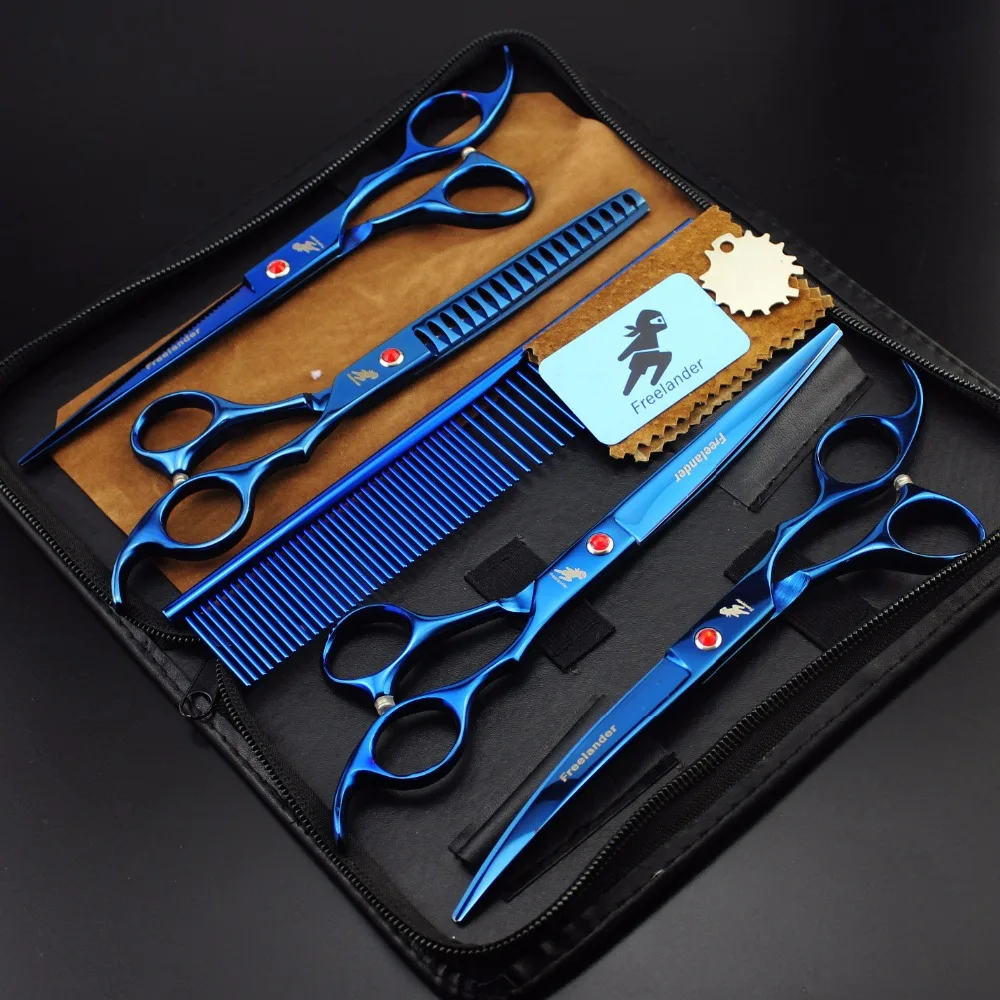 Product Name: 7 cal niebieski nożyczki do sierści fryzjerskie zestaw 4 sztuka zestaw połączenie gięcia nożyczki przerzedzenie specjalne nożyczki japoński hairdressi