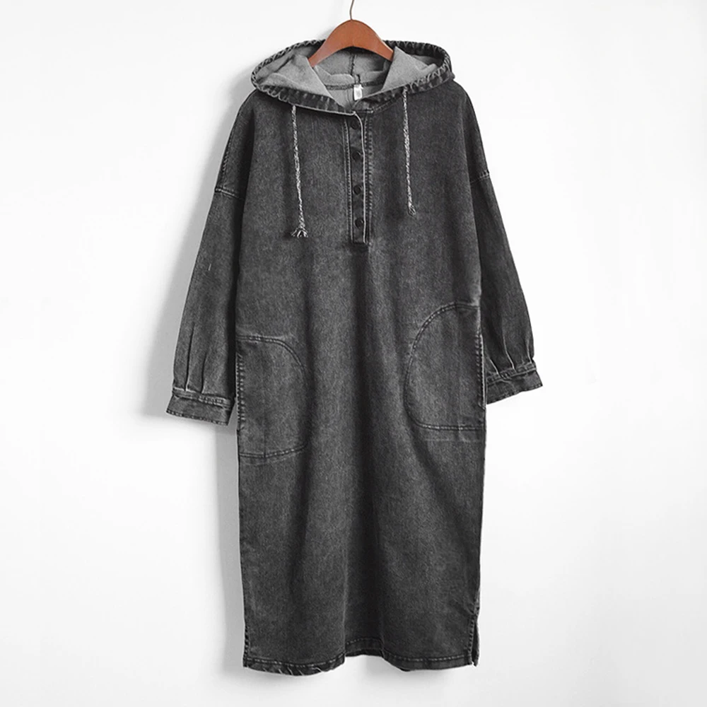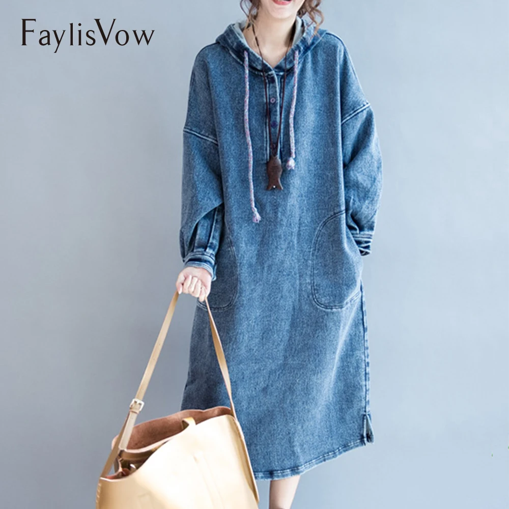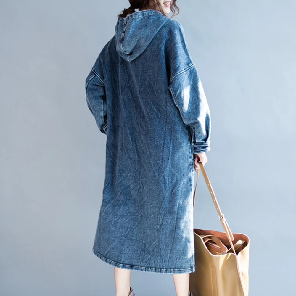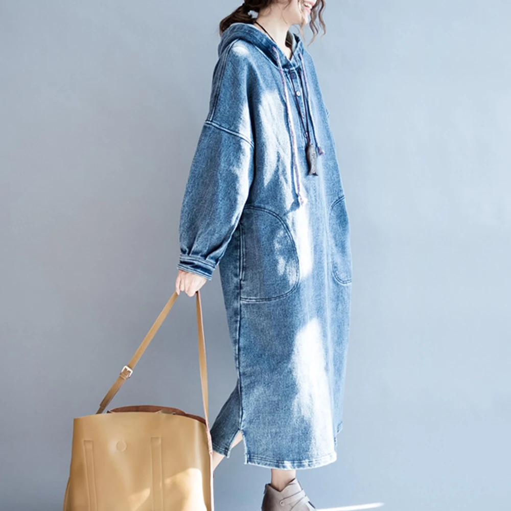 Special Offer Oversize niebieska sukienka jeansowa jesienno zimowa damska luźna bluza z kapturem sukienki maxi z długim rękawem z czapką dżinsy w dużym rozmiarze sukienka z kieszeniami Discount 39% Today!