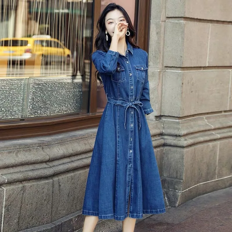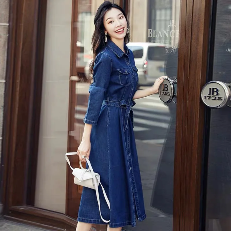 Product Name: Europa moda koszula dżinsowa sukienka kobiety z długim rękawem niebieskie dżinsy sukienki kieszenie wiosna jesień ubrania retro